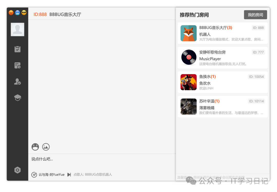 系统前端采用Vue + ElementUI构建,后端使用了SpringBoot +Websocket技术栈实现,支持在支持PC-Web、微信小程序、UniAPP、Windows客户端等多端使用,十分适用于搭建社群聊天室、KTV点歌平台、音乐分享空间等系统。