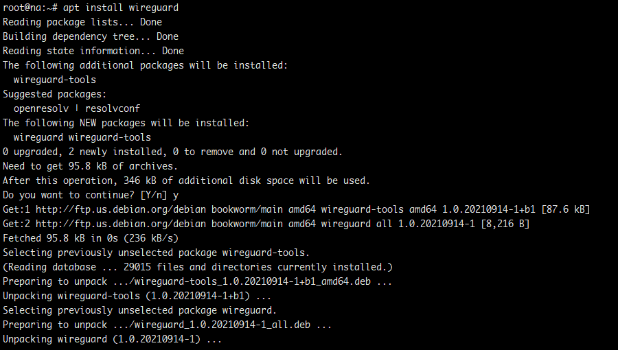由于 WireGuard 服务器软件已经在 Debian 软件库中可用,所以可以直接使用如下命令进行安装:
