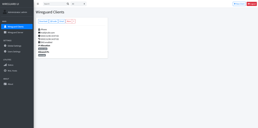 至此,我们成功部署了一台 WireGuard VPN 服务器,并配备了基于 Web 的管理界面。WireGuard-UI 提供了一个简洁的控制面板,方便我们添加新设备、生成二维码以及监控活动连接,而无需手动处理密钥、配置文件和路由规则。