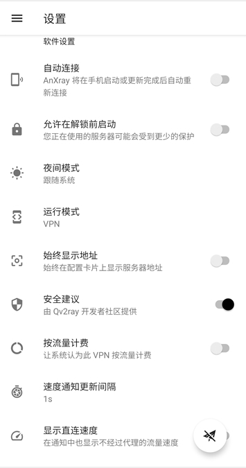 AnXray 的设置项是应用工作时的具体选项,如果对于每个设置项不是很了解的情况下,建议保持默认设置即可。当然可以根据自己喜好关闭是否自动连接以及解锁前启动等简单选项。