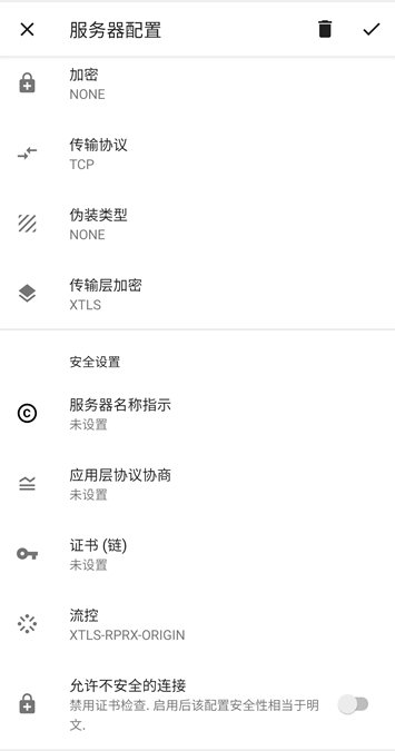 如果服务器端设置了传输层加密,则可以在 AnXray 中进行对应设置。为了隐蔽代理数据,目前代理服务器一般会采用传输层加密方式传输数据,以提高安全性。和 Xray 配合最好的当然是 XTLS 加密方式,点击传输层加密,选择 XTLS,会出现对应的配置内容: