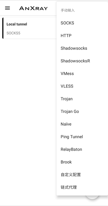 可以看到,AnXray 支持的协议非常丰富,常用的开源代理服务协议都可以使用,这要归功于 Xray 强大的核心。连接 Xray 服务器,当然选择 VLESS 协议: