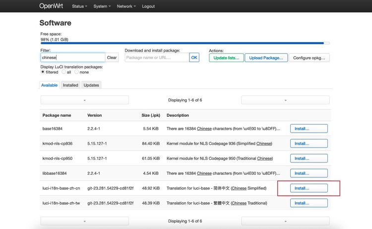 选择”System”菜单的”Software”菜单项,进入软件管理页面。点击”Update lists”按钮更新可用软件包。更新完成后,可以安装的软件包会在页面下方列表显示。可以在”Filter”输入框中输入内容用于筛选所需软件包,例如希望安装中文语言,则可以输入”chinese”,就会显示所有与之相关的软件包。需要安装软件,只需要点击软件包后面的”Install”按钮即完成了软件包的安装。