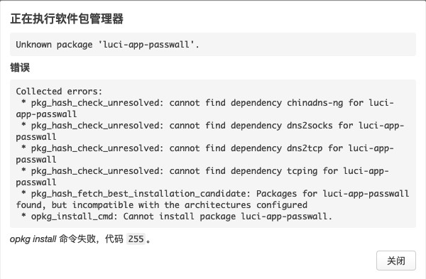 我们首先上传 passwall 软件包”luci-app-passwall_4.71-2_all.ipk”进行安装,由于未安装相关依赖,会出现如下报错信息: