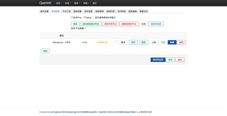 根据节点配置手动添加节点或通过链接导入节点后,点击”保存并应用”保存节点信息。添加成功的节点会在节点列表选项卡显示,点击测试连接按钮可以显示节点的可用性情况: