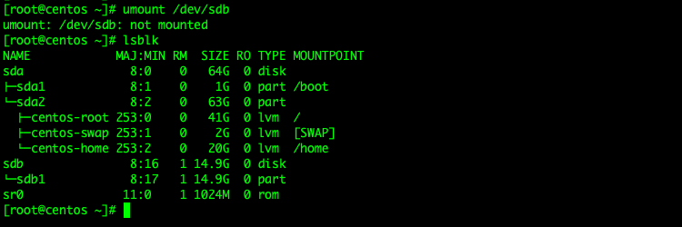# umount /dev/sdb # lsblk