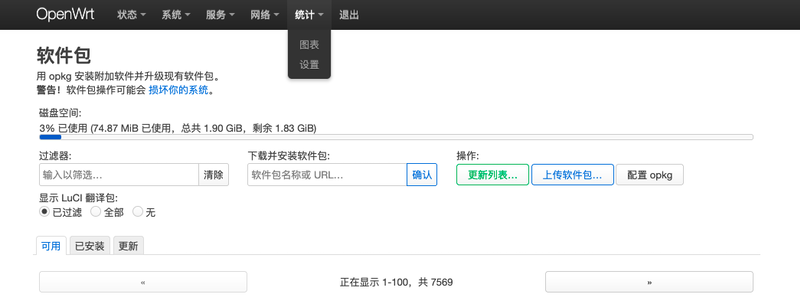 首先安装一个软件包”luci-app-statistics”,如果在 OpenWrt 的 LuCI 界面包管理工具安装,则会自动安装对应的语言包,使用起来则更为方便。