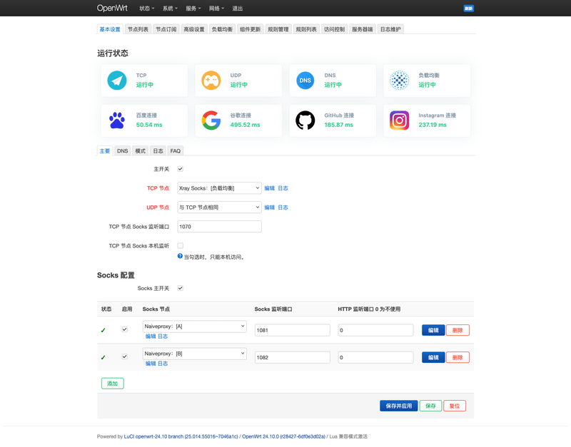 最后,TCP 和 UDP 节点均选择使用 负载均衡节点,就会将流量导入 HAProxy,并由其进行流量调控。Passwall 的负载均衡功能也正式生效了。