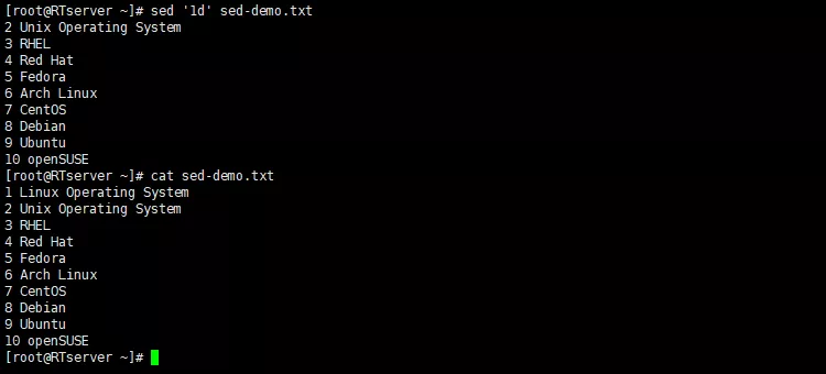 注释:由于是示例操作,演示 sed 命令时将不使用 -i 参数(这个参数指直接执行),也就是只显示执行结果而不对文件本身进行修改。