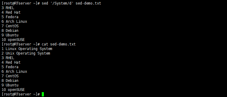 # sed '/^R/d' sed-demo.txt //删除文件所有以 R 开头的行