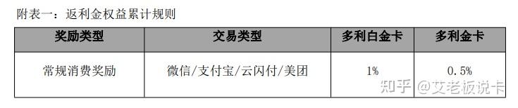 调整前的规则:以多利白金卡为例,卡友在美团、滴滴、星巴克等指定商户消费可享10%返现,微信支付、支付宝、云闪付消费享1%返现。当月消费满3000元,即可兑换100元返利金,综合返现比例约为3.3%。