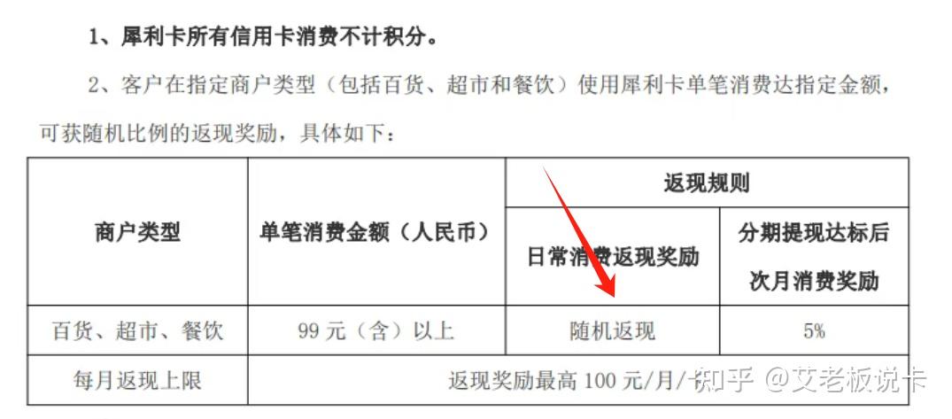 调整后的规则:新规则下,餐饮、超市、百货类型消费改为随机返现。同时,分期或提现达标后,有机会享上述类型消费笔笔5%返现。月返现上限仍为100元。