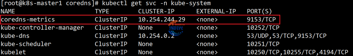 [root@k8s-master1 coredns]# vim coredns-svc.yamlapiVersion: v1kind: Servicemetadata:name: coredns-metricsnamespace: kube-systemlabels:app: cordns spec:ports:- name: croedns-metricsport: 9153protocol: TCPtargetPort: 9153selector:k8s-app: kube-dnssessionAffinity: Nonetype: ClusterIP[root@k8s-master1 coredns]# kubectl apply -f coredns-svc.yaml[root@k8s-master1 coredns]# kubectl get svc -n kube-system