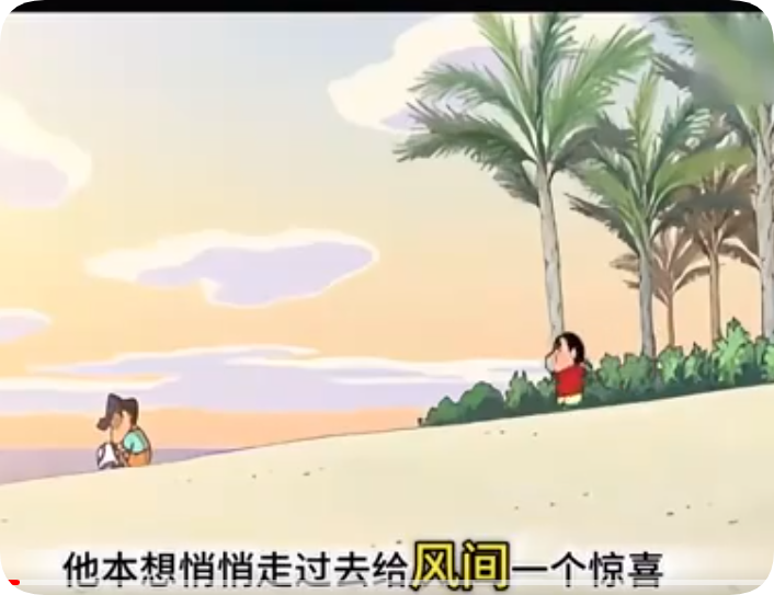 在厕所门口小新找到了风间爸爸,但小新没有对风间爸爸直接说这个事,而是对他说:夕阳让大海变得好漂亮,我们一起去看好不好?