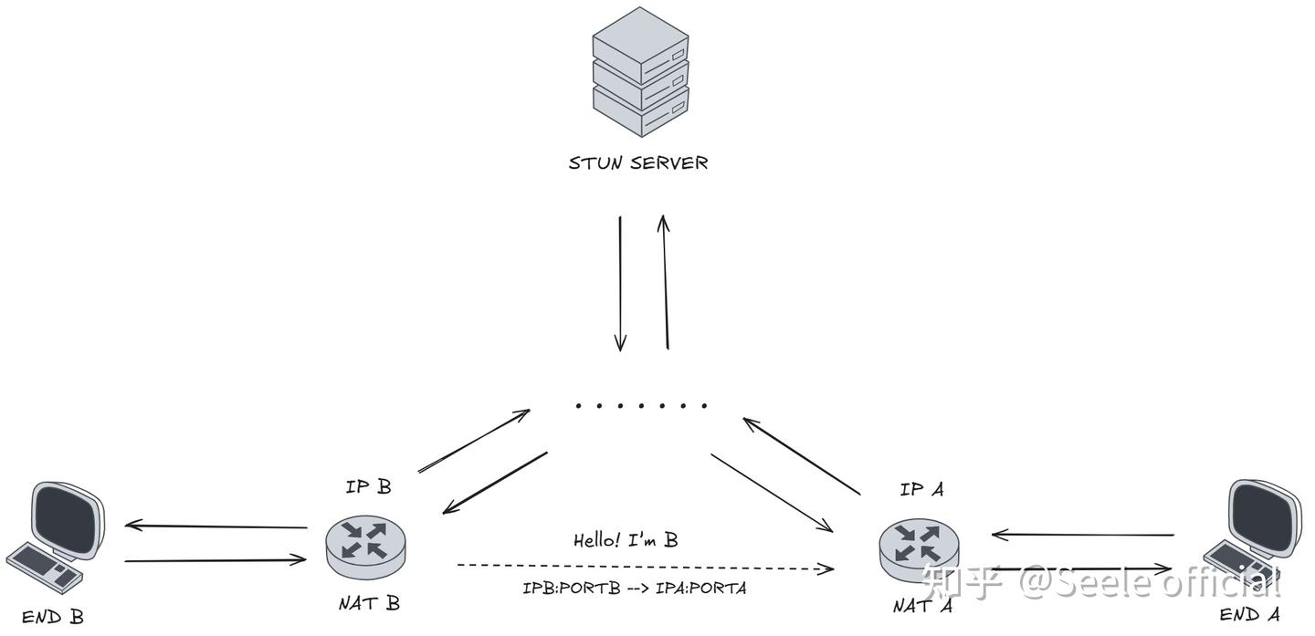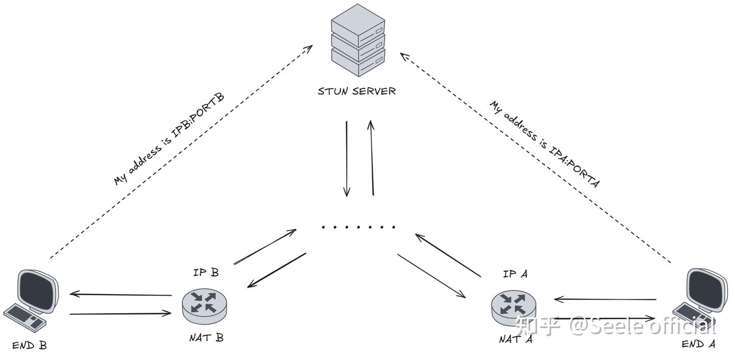 END A尝试与STUN SERVER建立 UDP 连接,于是NAT A便将该连接绑定到IP A:PORT A上,STUN SERVER便可从发来的 IP 数据包中解析出对应IP A:PORT A。END B尝试与STUN SERVER建立 UDP 连接,于是NAT B便将该连接绑定到IP A:PORT B上,STUN SERVER便可从发来的 IP 数据包中解析出对应IP B:PORT B。