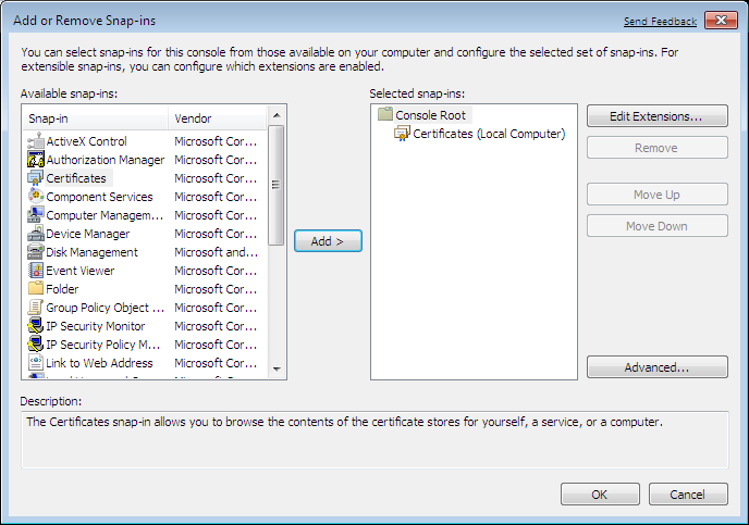To install the trusted CA certificate locally, call up the Microsoft Management Console (mmc) and add the Certificates Snap-In: