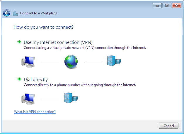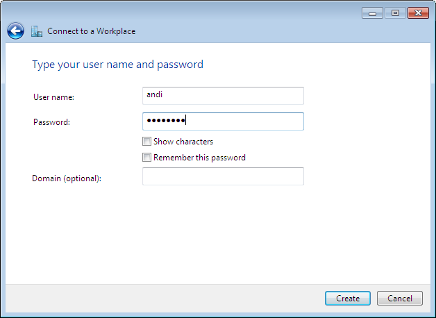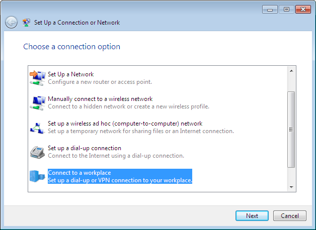 In the Network and Sharing Center choose Set up a new connection or network and as a connection option select Connect to a workplace:
