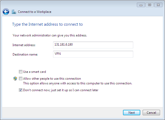 Enter the IPv4 or IPv6 internet address or the fully-qualified hostname of the strongSwan VPN gateway. The destination name string can be chosen freely, let's call the connection VPN: