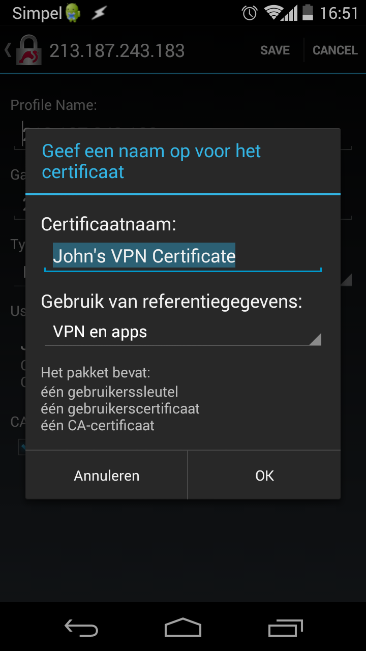 On Android with the StrongSwan Application you can just import the .p12 we are going to create later on. On Windows 7, we'll use EAP to configure a username and password for our client.
