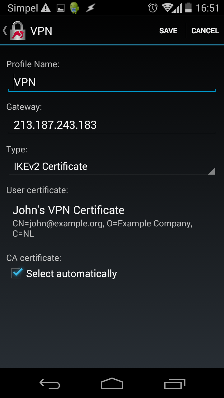 IPSec-IKEv2[4]: ESTABLISHED 20 seconds ago, 213.187.243.183[C=NL, O=Example Company, CN=vpn.example.org]...198.44.82.171[C=NL, O=Example Company, CN=john@example.org]