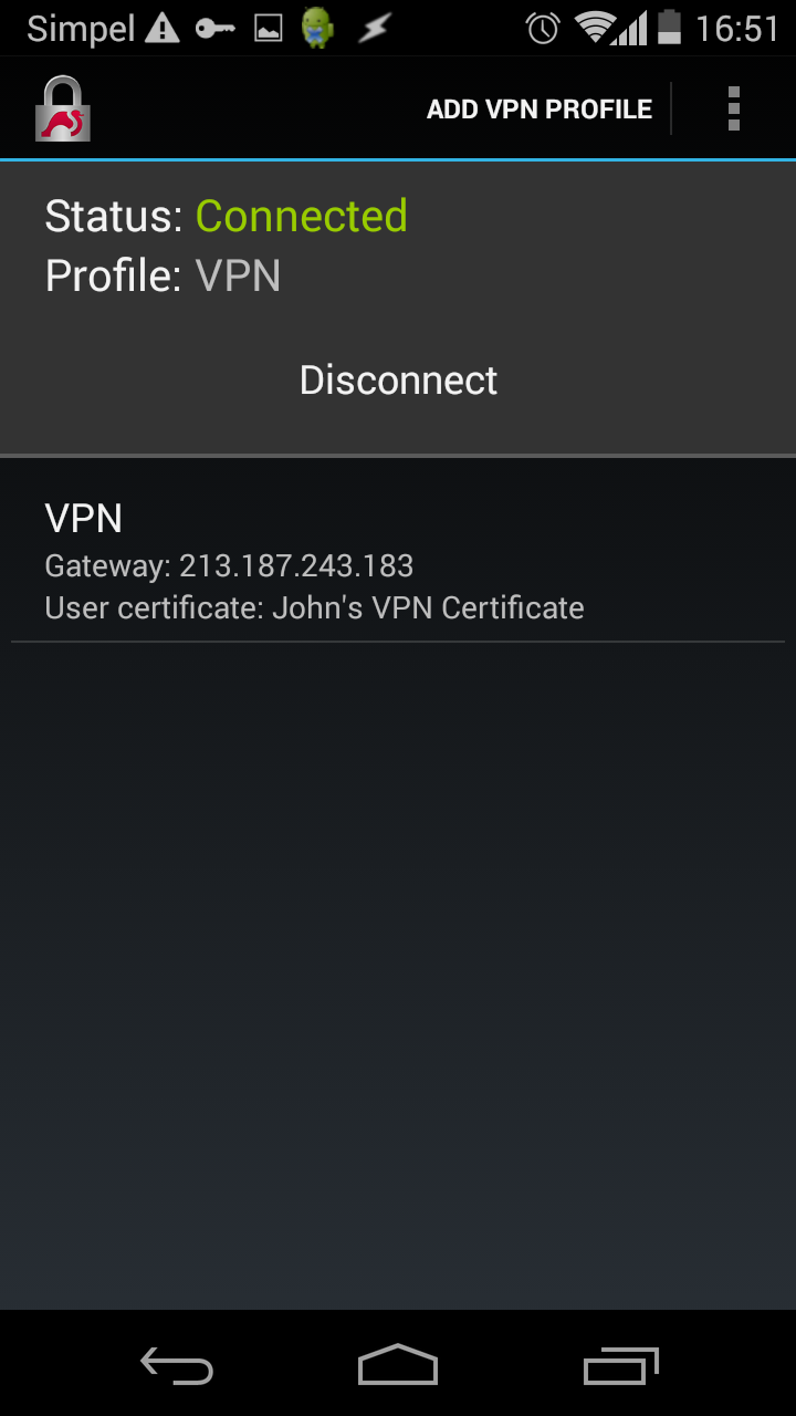 A VPN client needs a client certificate, its private key, and the signing CA certificate. The most convenient way is to put everything in a single signed PKCS#12 file and export it with a paraphrase.